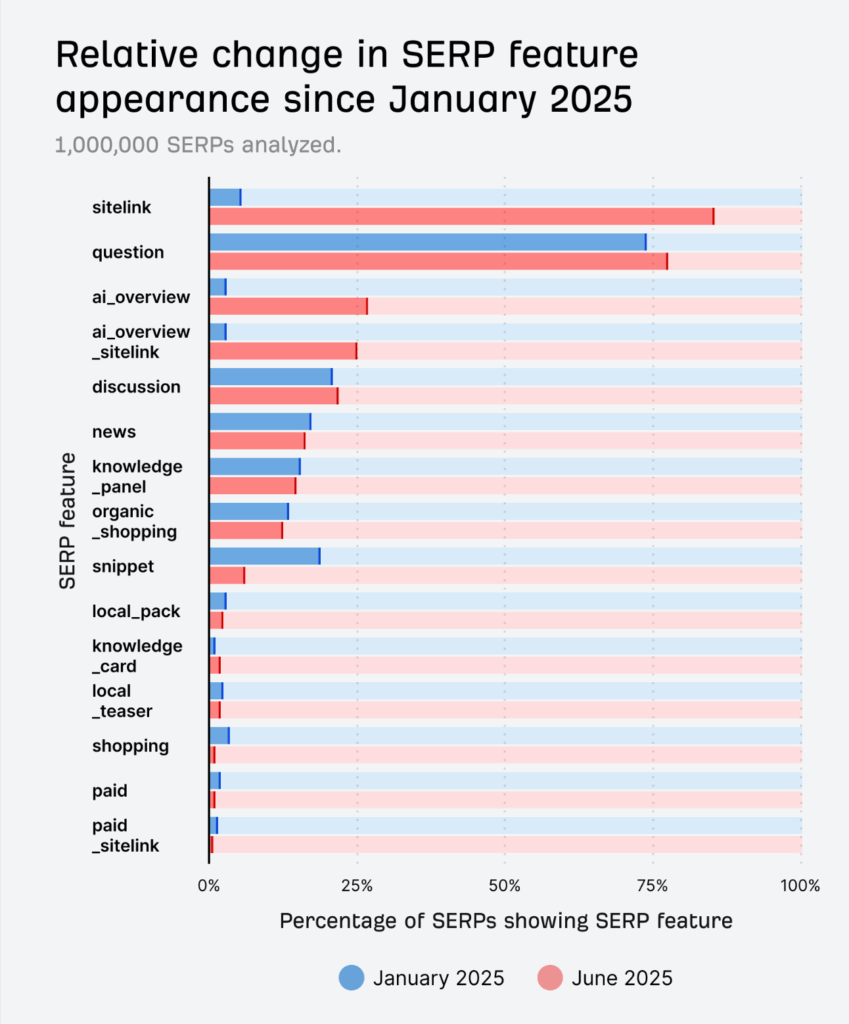 O estudo da Ahrefs descobriu que, entre janeiro e junho de 2025, a presença das AI Overviews cresceu uns impressionantes 598%, aparecendo agora em mais de um quarto das palavras-chave analisadas.