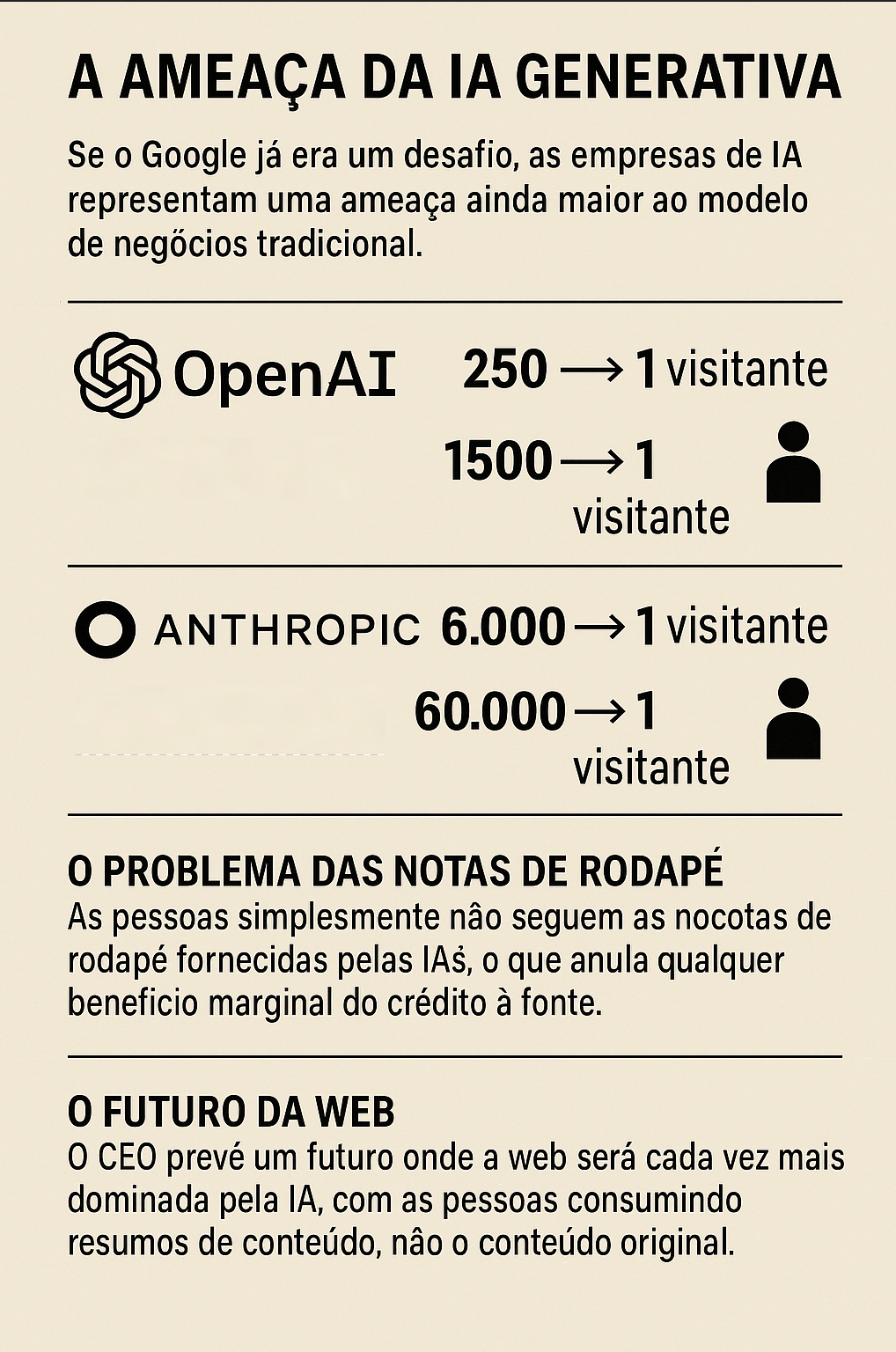 Se o Google já era um desafio, as empresas de IA representam uma ameaça ainda maior ao modelo de negócios tradicional.