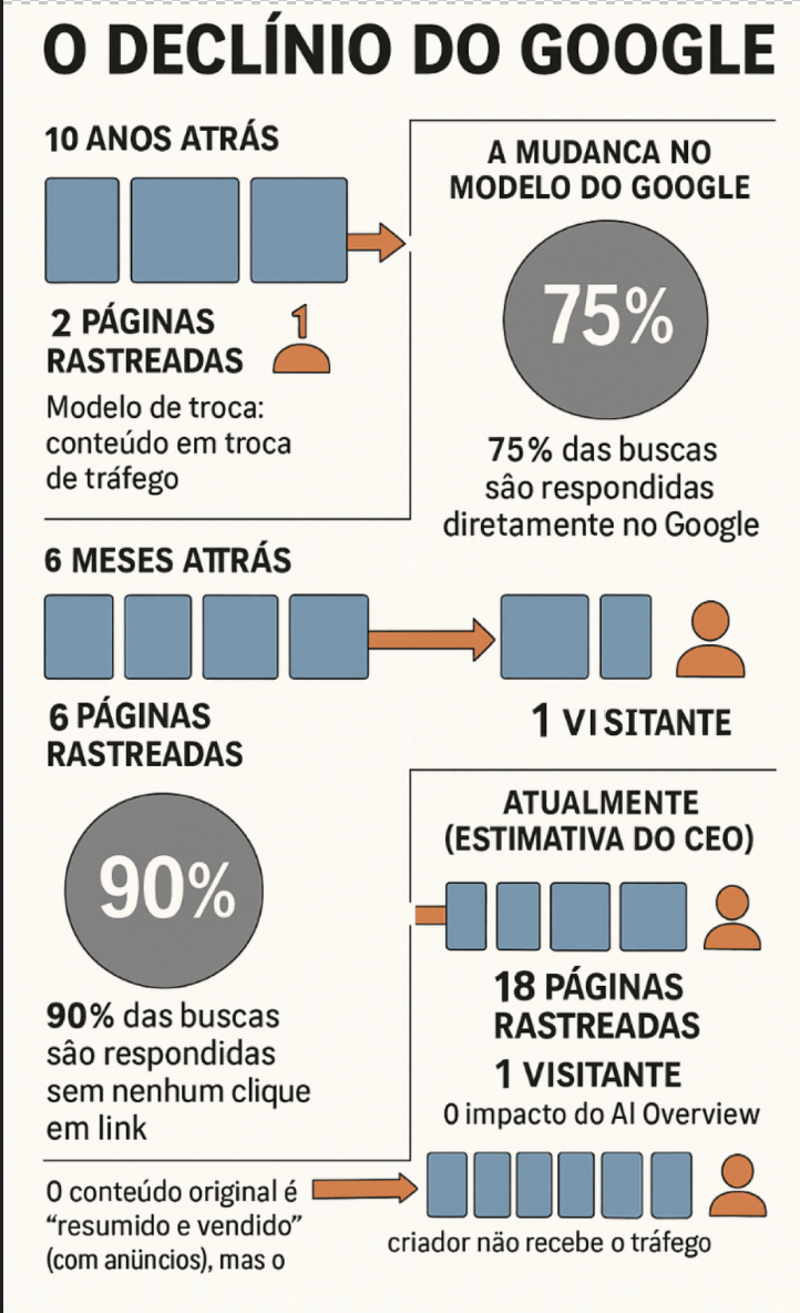 - A proporção atual é de 18 páginas rastreadas para cada 1 visitante. Isso significa que o cenário piorou três vezes só nos últimos seis meses, diretamente atribuído ao “AI Overview” do Google, que sintetiza conteúdo de múltiplas fontes.
