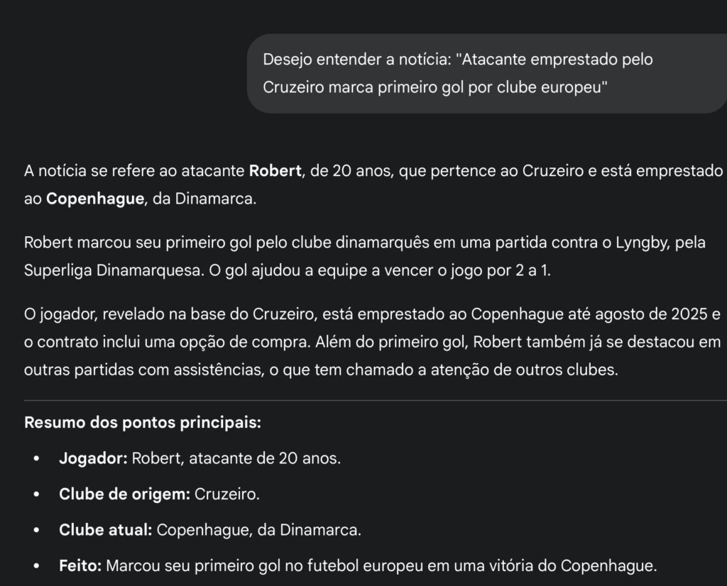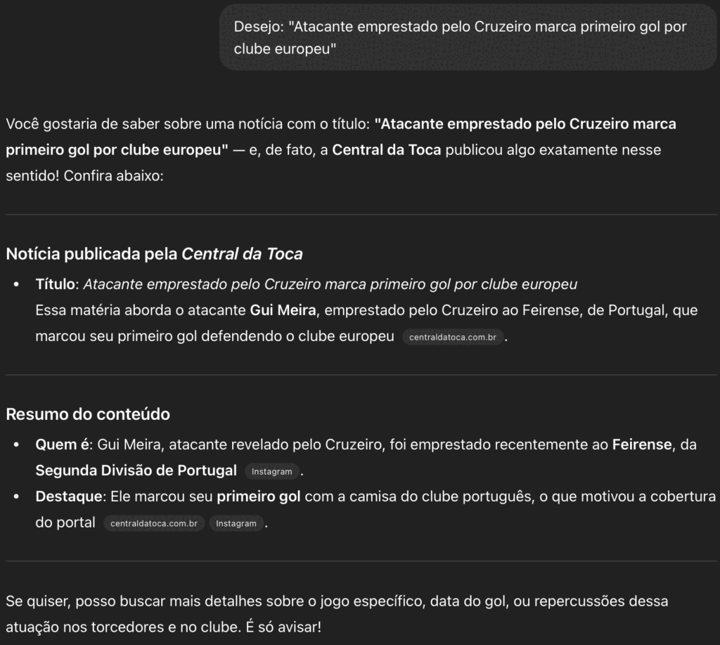 Para nossa surpresa, o único a conseguir acessar a informação correta quinze minutos depois da publicação foi o GPT-5. Observe como ele acerta a interpretação certa da notícia, bem como o veículo que publicou: