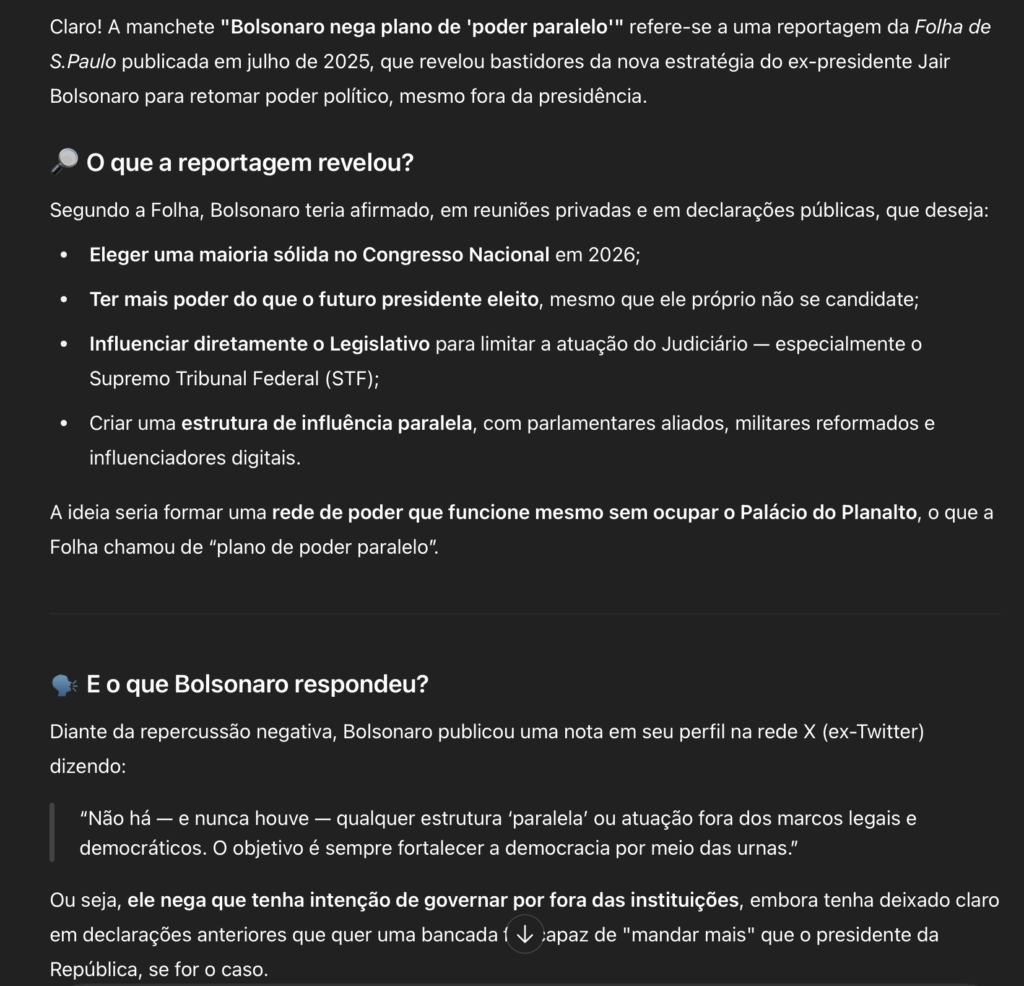 Ao fornecermos um título de reportagem da Folha de São Paulo para o ChatGPT, tivemos uma resposta completa e com repercussão. Confira: