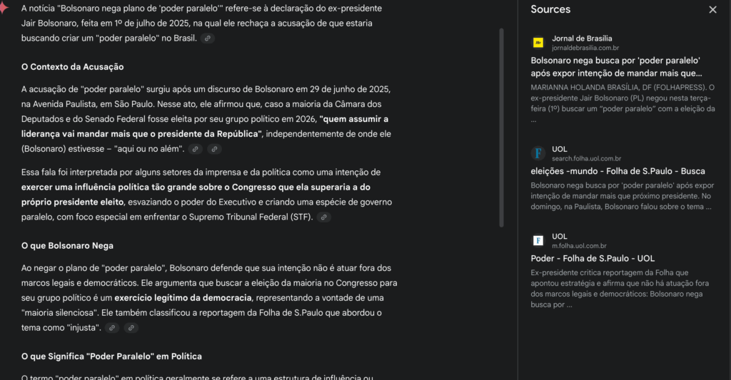 Gemini, da mesma forma, não conseguiu fazer uma citação direta ao conteúdo. Usou a Folhapress e fez buscas na estrutura do site: