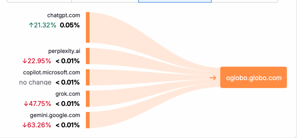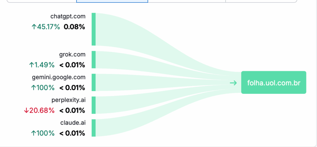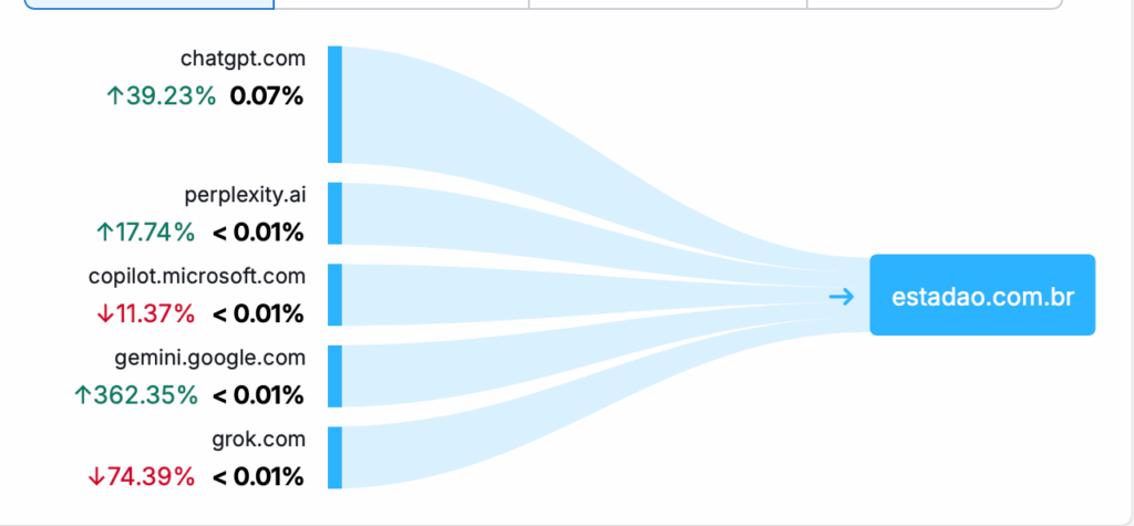 Consta-se, ainda, que para Estadão, Perplexity é mais representativa. Por outro lado, embora Gemini ainda envie pouco tráfego, apresenta o maior crescimento.