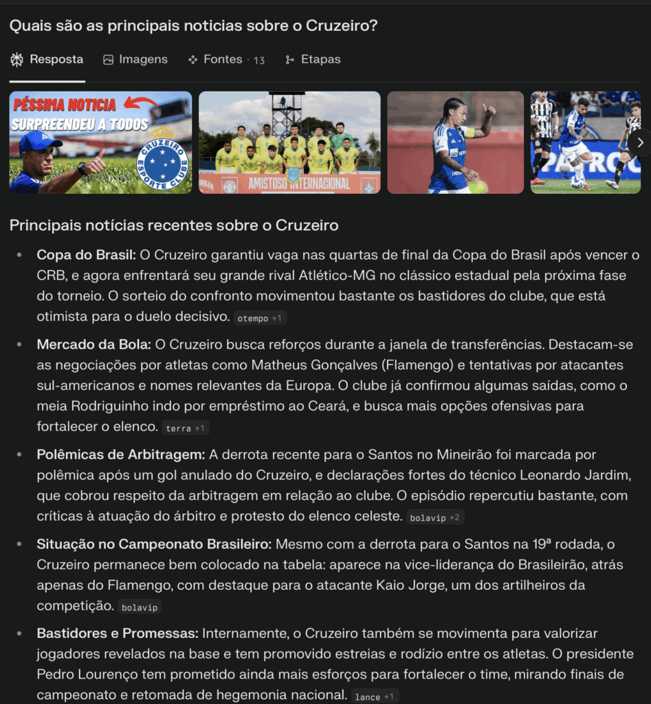 Observe na imagem abaixo como as IAs auxiliam a uma experiência satisfatória de consumo de notícias. Um dos melhores resultados obtidos é com Perplexity. Confira: