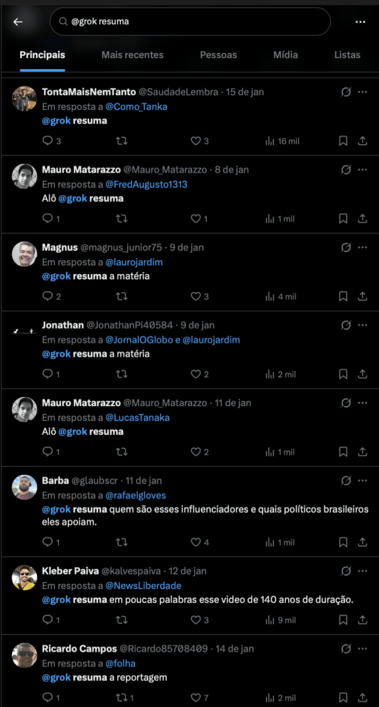 Apenas nas últimas 24 horas, 72 pedidos de resumos foram feitos, de maneira literal, no X. Após o pedido, todos os usuários impactados com a publicação podem ver o resumo feito em páginas da Internet, arquivos e vídeos.