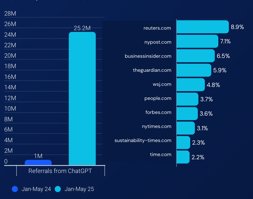 Para os editores de notícias, a era da IA se apresenta como uma faca de dois gumes. Por um lado, o tráfego de referência vindo diretamente do ChatGPT explodiu, saltando de menos de 1 milhão de visitas entre janeiro e maio de 2024 para mais de 25,2 milhões no mesmo período de 2025 — um aumento de 25 vezes. Veículos que se adaptaram a essa nova realidade estão colhendo os frutos, com reuters.com (8.9%), nypost.com (7.1%) e businessinsider.com (6.5%) liderando a lista de maiores beneficiários.