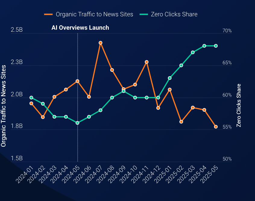 No entanto, essa vitória vem acompanhada de uma perda alarmante. O relatório correlaciona a ascensão da IA com a queda do tráfego orgânico tradicional. Desde o lançamento do AI Overviews do Google em maio de 2024, a parcela de “buscas de clique zero” — onde o usuário obtém a resposta diretamente na página de resultados, sem clicar em nenhum link — aumentou de 56% para quase 69%. Consequentemente, o tráfego orgânico para sites de notícias despencou de um pico de mais de 2,3 bilhões de visitas para menos de 1,7 bilhão.