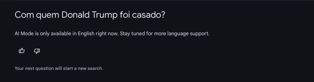 O Não é Agência conseguiu, ainda via VPN, que o Modo IA respondessem em português. Nesse momento, entretanto, não são todas as respostas que estão disponíveis na língua.