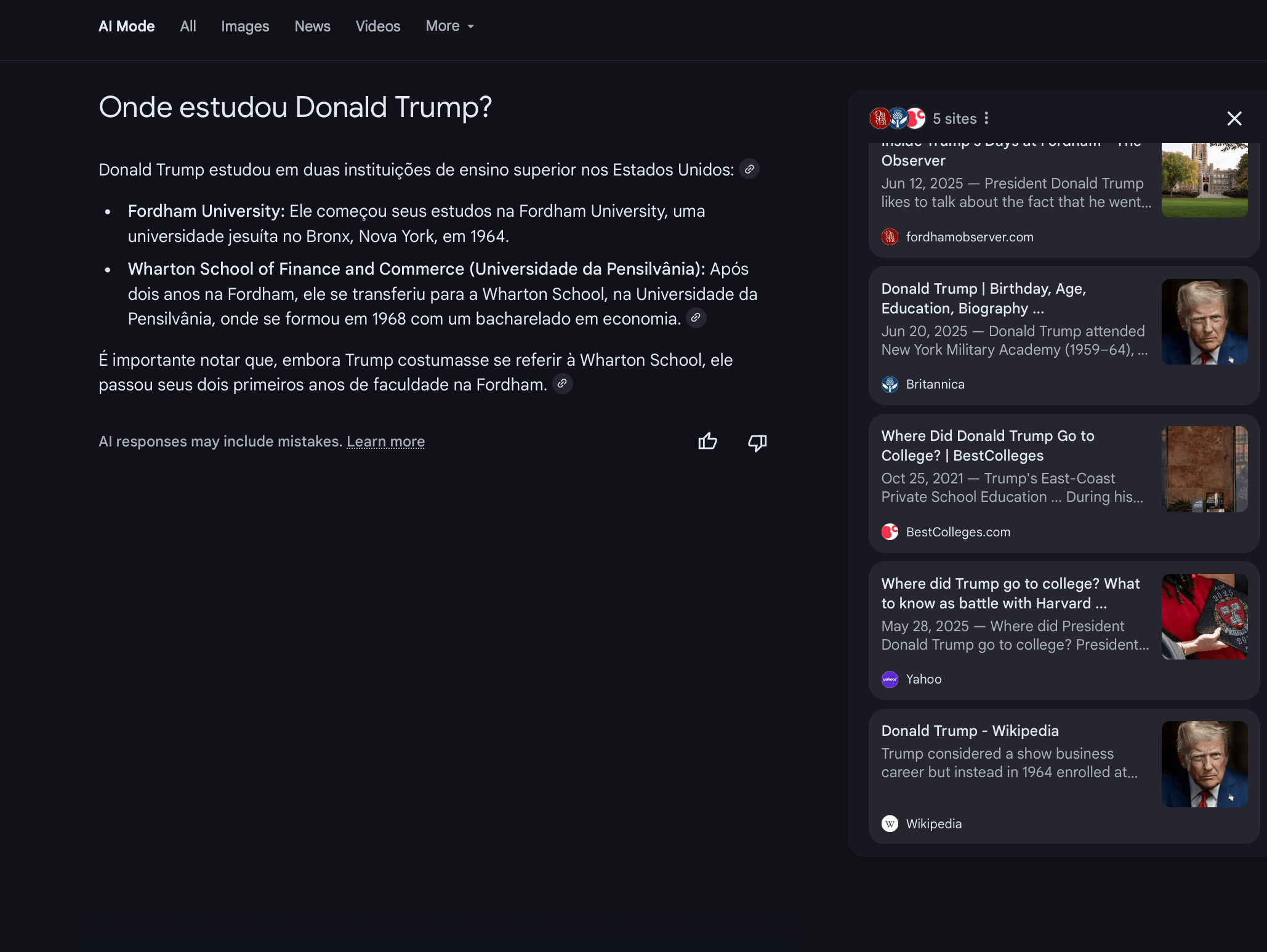 Para conseguir que o Modo IA dê respostas em português, além de usar VPN, também fizemos uma pergunta em inglês sobre Donald Trump. Depois, ao acessar o Modo IA, conseguimos fazer perguntas em português, que foram prontamente respondidas.