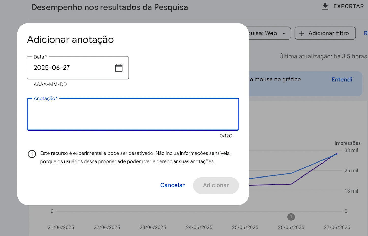 Ao observar uma queda ou um pico de tráfego, ter anotações próximas a esse período no gráfico auxilia na formulação de hipóteses mais rápidas e na investigação das causas com maior precisão. Por exemplo: “Será que foi aquela atualização de conteúdo que implementamos no dia X?”