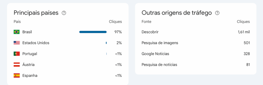 Também é possível ver cliques por país e outras fontes de tráfego dos serviços Google: