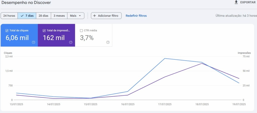 Nos últimos dias, a segmentação comum do Discover foi a marca do serviço. Novamente, conseguimos ver conteúdos locais e de portais que visitamos com frequência. Vale lembrar que, depois de abril, vários sites segmentados deixaram de ter importância no produto.