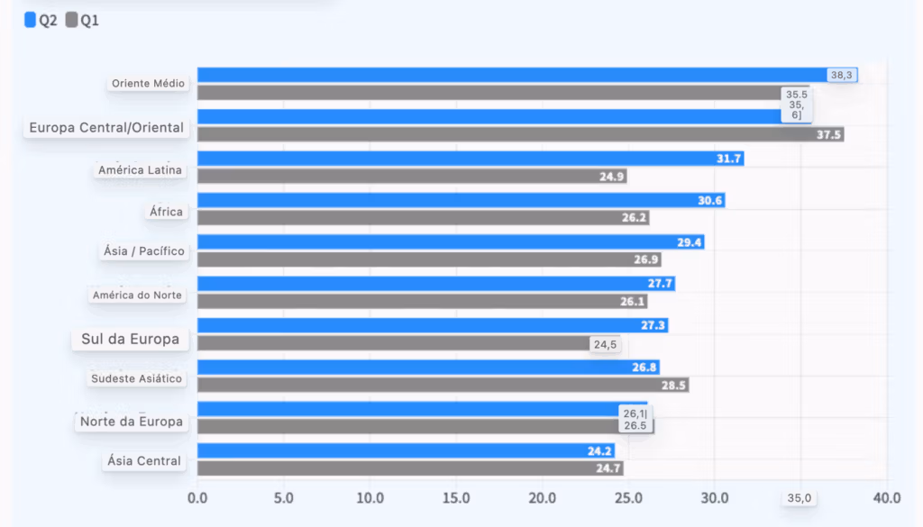 O comportamento do usuário digital na América Latina é um estudo de contrastes. No segundo trimestre, observamos um público mais engajado, que passa mais tempo consumindo conteúdo. No entanto, essa maior atenção vem acompanhada de uma profunda mudança nos canais de aquisição, com as redes sociais ganhando o espaço antes dominado pela busca orgânica.
