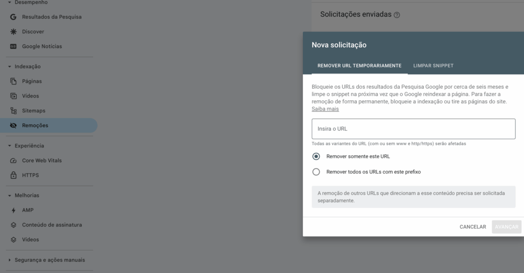 Nesse caso, também usaríamos o Google Search Console para ajudar o processo. Agora, para limpar snippets. Deve-se ir em “Remoções”, depois em “Limpar Snippet”.
