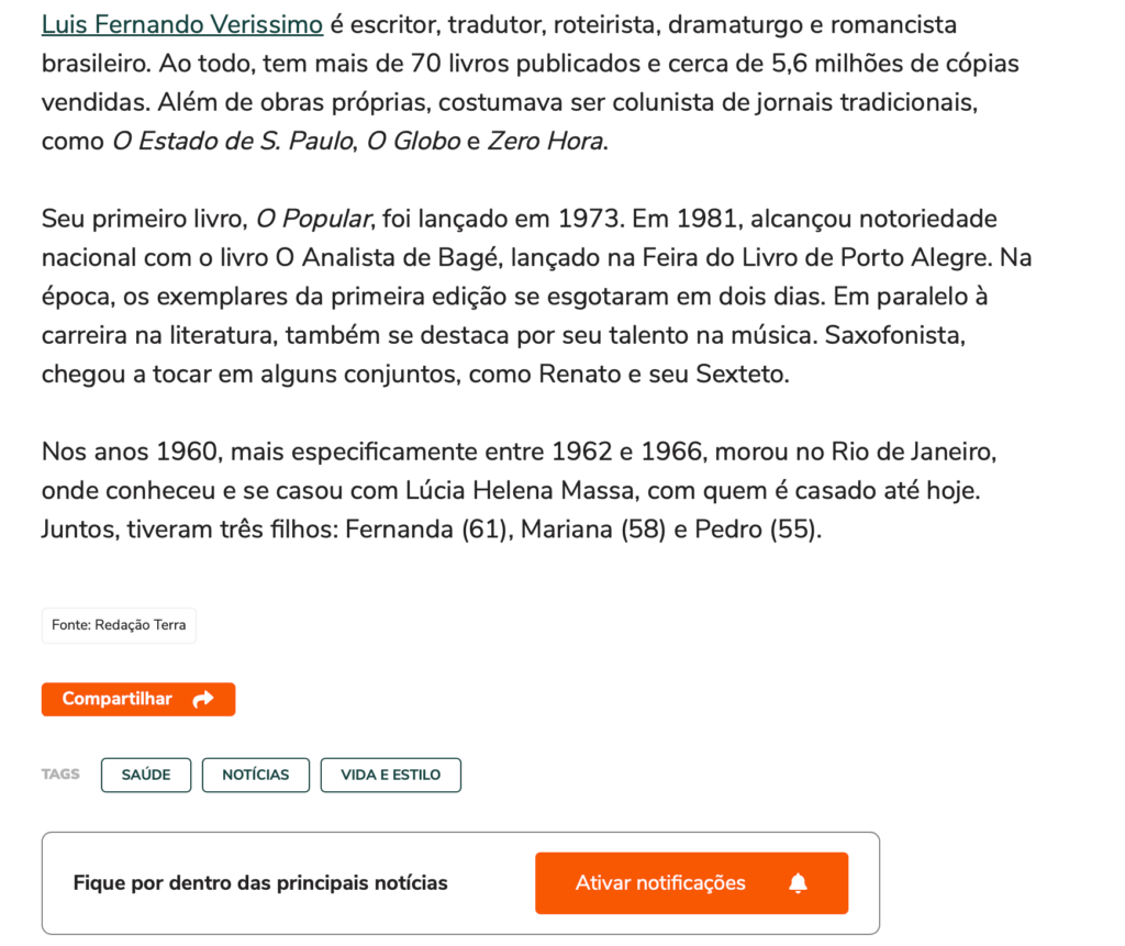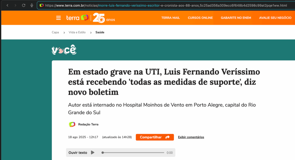 Às 20h, ao procurar no Google, ainda era possível encontrar a “informação” da morte de Luis Veríssimo. Embora não seja possível dizer que ele passa bem, ainda está vivo.
