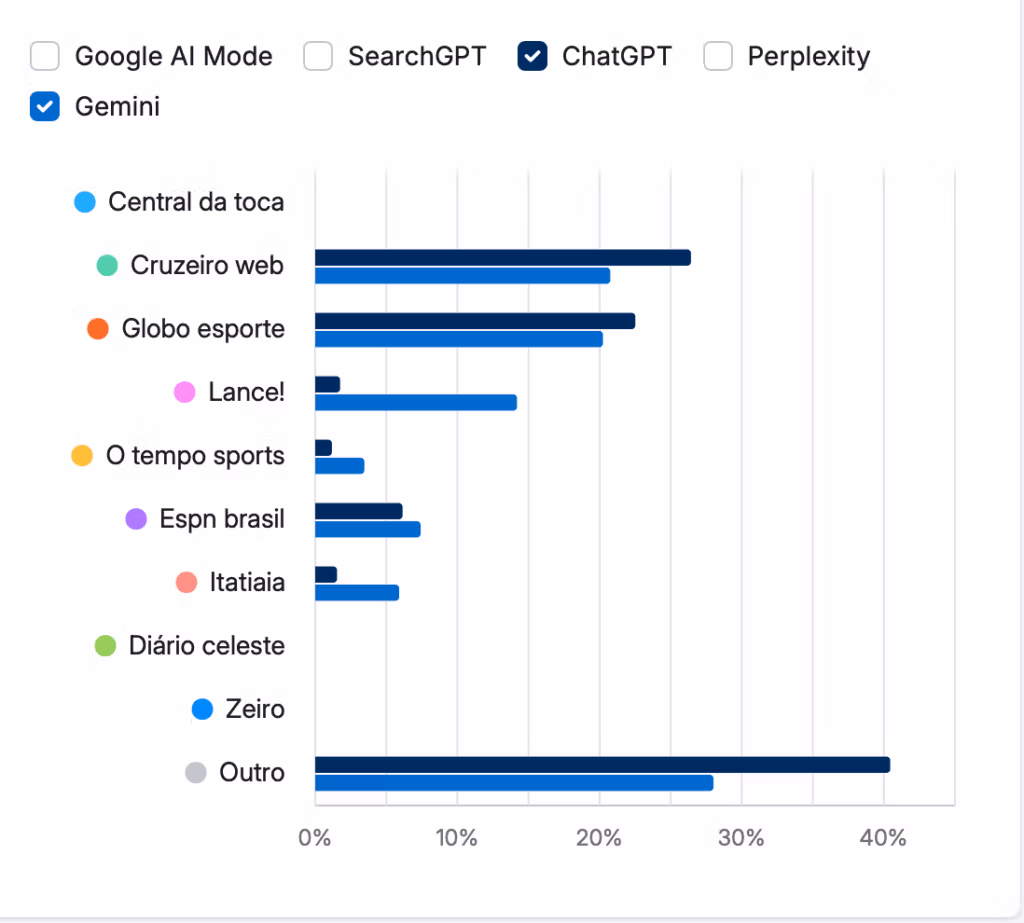 Ironicamente, o ChatGPT é mais concentrado e mais diverso ao mesmo tempo. Por um lado, os principais portais (site oficial do Cruzeiro) e o GE tem concentração maior que em Gemini. Por outro, 40% da visibilidade são para portais não listados aqui.