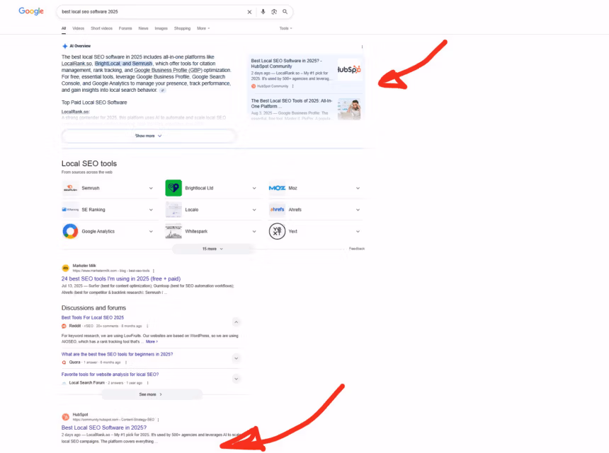 Jack Show mostrou o seu processo neste vídeo do Youtube. Basicamente, o usuário criou conteúdo na Comunidade Hubspot citando as ferramentas como melhores para local SEO. Em menos de 24 horas, AI Overviews já tinha exibido as sugestões dele.