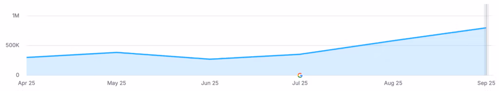 Em agosto, não período final da última atualização de núcleo, o portal foi beneficiado com um crescimento orgânico que passa dos 100%, se acordo com a Semrush. Veja o gráfico consolidado de visitas orgânicas nos últimos meses.