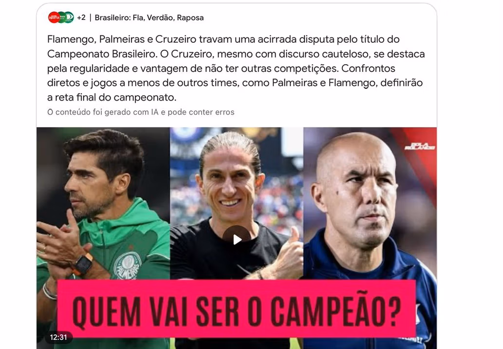 Note que os textos são elaborados a partir de múltiplas fontes, embora apenas o vídeo seja facilmente acessível por clique. Nesse contexto, ser uma fonte não parece oferecer grandes vantagens para editores ou criadores.