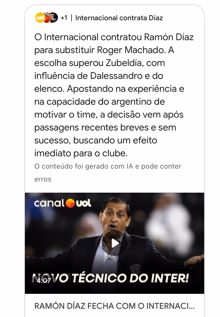 Note que os textos são elaborados a partir de múltiplas fontes, embora apenas o vídeo seja facilmente acessível por clique. Nesse contexto, ser uma fonte não parece oferecer grandes vantagens para editores ou criadores.