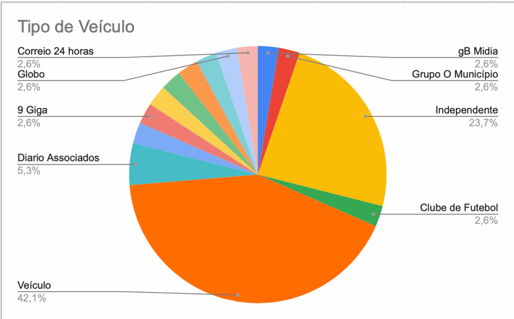 Separamos também por tipo de veículo. Nesse caso, quando o portal pertence a outra marca ou conglomerado, anotamos o respectivo nome. Por outro lado, separamos como Independente os portais que não apresentam expediente ou equipe responsável. Como veículo, todo site que tem registrado equipes e informações claras da empresa.